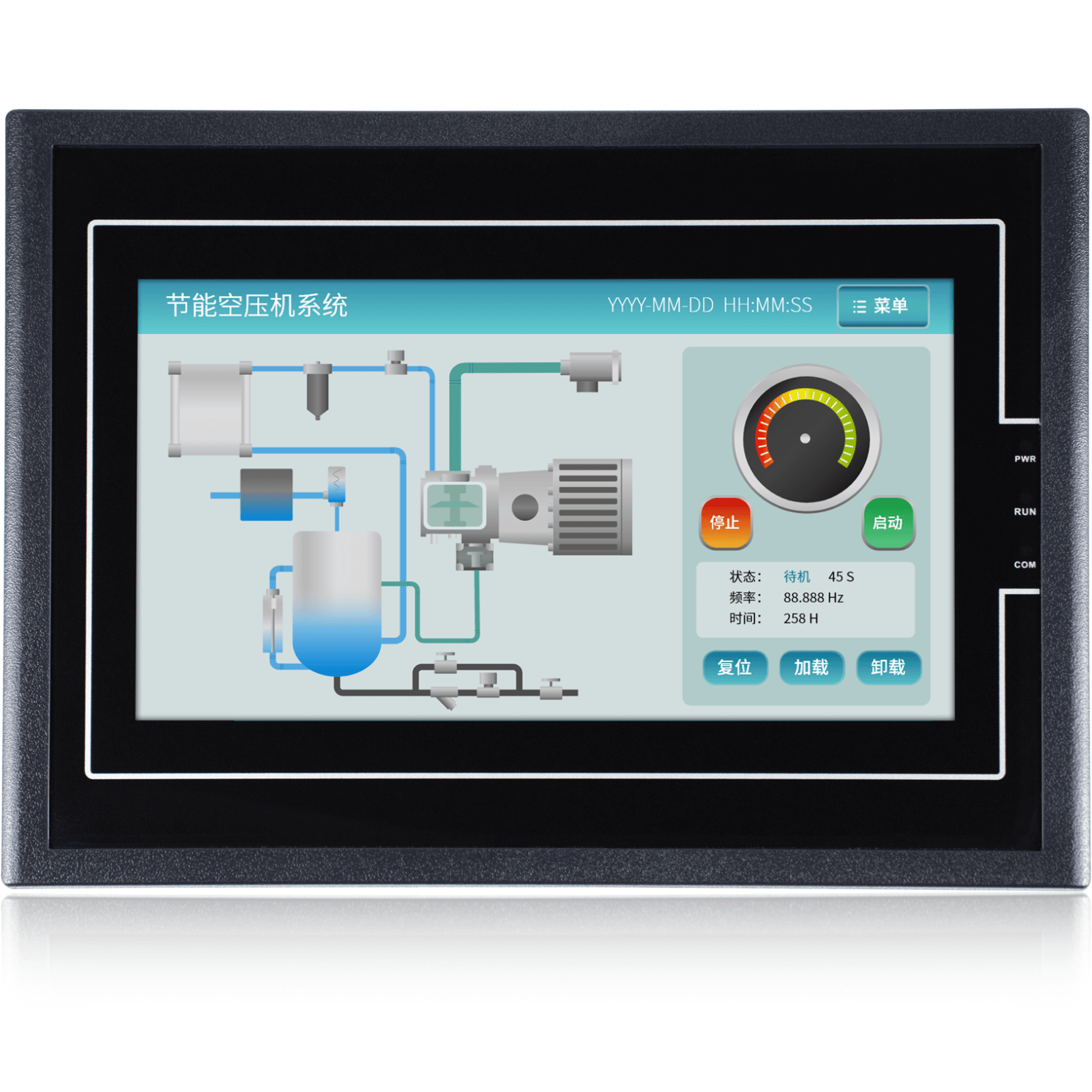 金璽HMI在變頻器的應(yīng)用,采用MODBUS協(xié)議與變頻器通訊,對(duì)變頻器進(jìn)行啟停控制,對(duì)變頻器的電流,頻率,功率等進(jìn)行監(jiān)控。